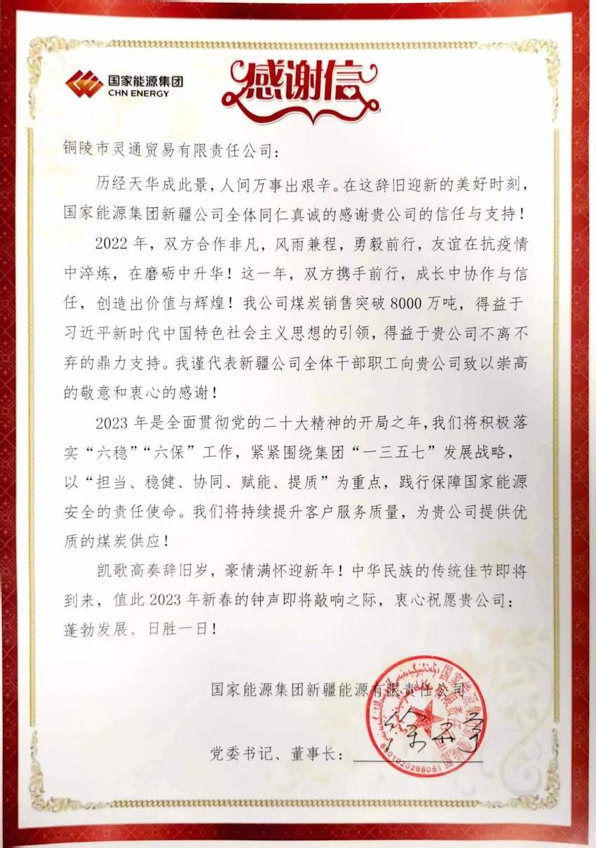 隨后,安徽靈通集團(tuán)回函感謝,對(duì)長(zhǎng)期以來給予集團(tuán)大力關(guān)心支持的國(guó)家能源集團(tuán)新疆能源公司致以崇高的敬意和衷心的感謝。并表示在新的一年里雙方將繼續(xù)深化合作,統(tǒng)籌資源市場(chǎng),在全面貫徹落實(shí)黨的二十大精神開局之年、實(shí)施“十四五”規(guī)劃的關(guān)鍵之年,攜手共繪未來高質(zhì)量發(fā)展的壯麗畫卷!