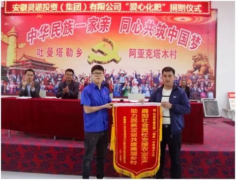 吐曼塔勒鄉(xiāng)黨委書記朱連飛代表鄉(xiāng)黨委、當(dāng)?shù)卣?,以及治區(qū)工信廳駐阿亞克塔木村“訪惠聚”工作隊(duì)對靈通集團(tuán)向阿亞克塔木村捐贈“愛心化肥”、用實(shí)際行動支持脫貧攻堅(jiān)、支持美麗鄉(xiāng)村建設(shè)的行為表示感謝。同時阿亞克塔木村黨支部書記努爾麥麥提·卡米力代表村委會向靈通集團(tuán)贈送了“勇?lián)鐣?zé)任支援農(nóng)業(yè)生產(chǎn) 助力脫貧攻堅(jiān)共建美麗鄉(xiāng)村”錦旗,送達(dá)了全體村民的感謝信,代表全體村民向自治區(qū)工信廳駐阿亞克塔木村“訪惠聚”工作隊(duì)長期以來對村民的關(guān)心關(guān)愛和無私幫助表示感謝,向靈通集團(tuán)的愛心捐贈表示感謝。